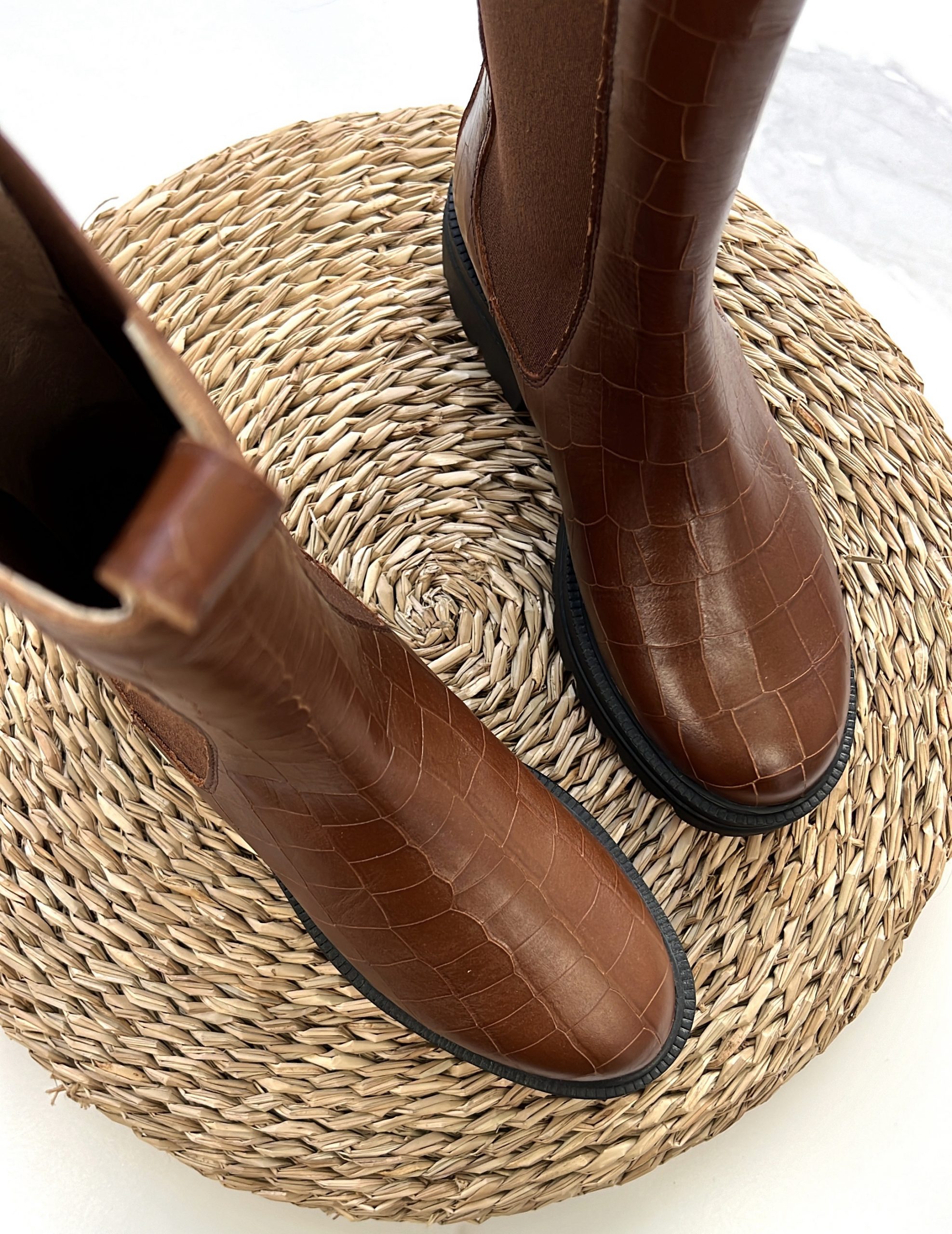 Botín chelsea con elásticos al tono en ambos lados, en piel coco cuero.