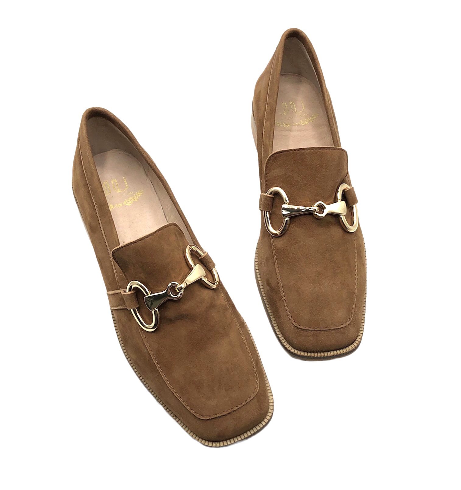 Piso de horma cuadrada y tacón de 2 cm de altura.