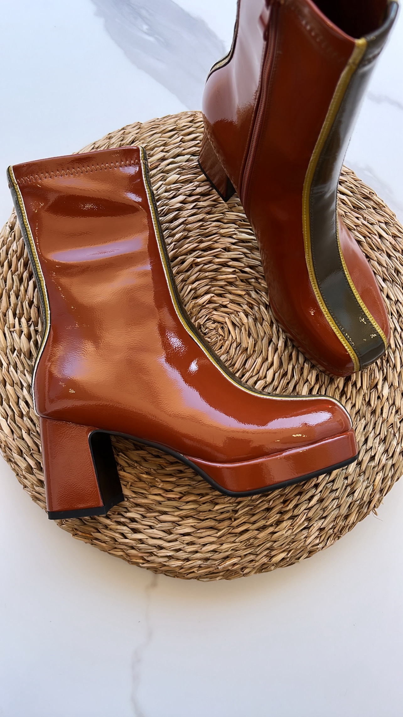 Noa Harmon 9106 Botín plataforma charol cuero, kaki y mostaza.